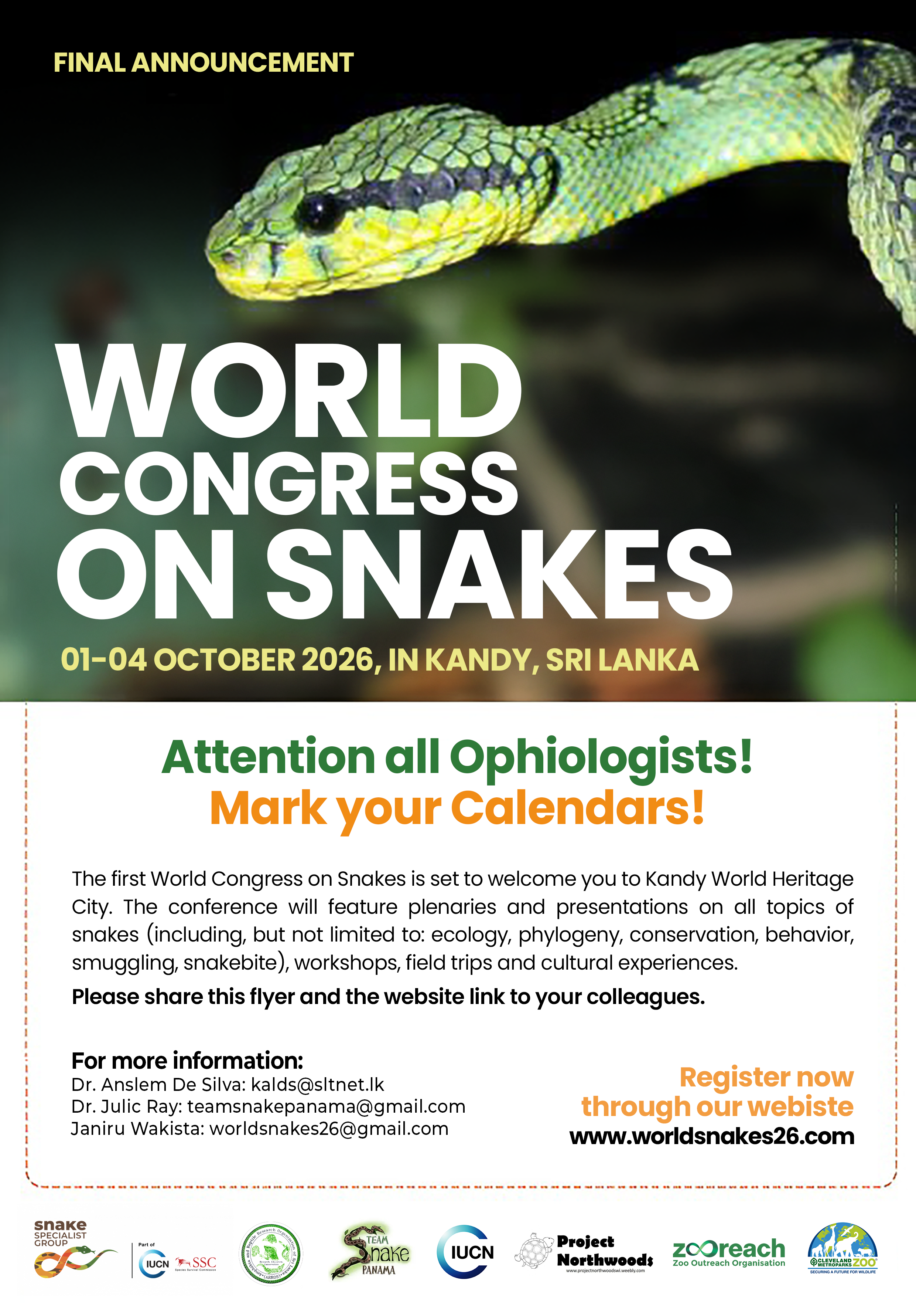 The first World Congress on Snakes will take place in Kandy, a World Heritage city. The conference will include symposiums, plenaries individual presentations and poster presentations covering a wide range of topics related to snakes, such as ecology, phylogeny, conservation, behavior, illegal trade, and snakebite.